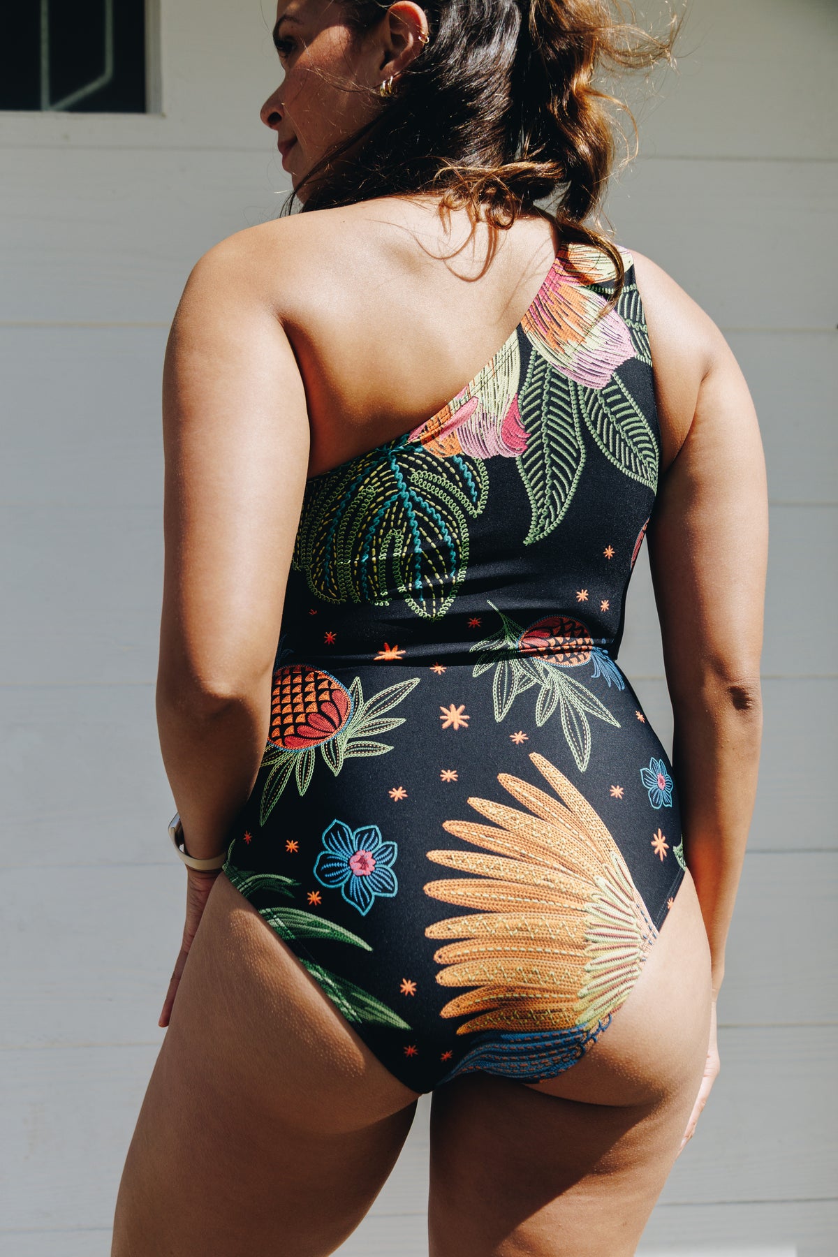 Stand out in our Tropical Melody one-piece swimsuit — a striking, sculpted silhouette designed for sunshine, saltwater, and summer adventures. With its bold diagonal neckline and streamlined moderate-to-full coverage, this one-piece offers the perfect blend of support, comfort, and standout style. Crafted in Brazil using premium polyamide, it smooths, shapes, and moves effortlessly with your body, giving you confidence whether you're poolside, ocean-swimming, or styling it as a bodysuit.